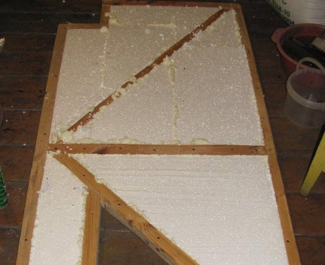 - De plus, le propriétaire peut clouer des lattes de bois le long du périmètre de la boîte. La zone résultante doit être remplie de mousse, après quoi la structure peut être gainée de clins. L'épaisseur du rail doit correspondre à la mousse. Mais cette méthode a un inconvénient : la conception ajoute du poids et des boucles supplémentaires sont nécessaires.