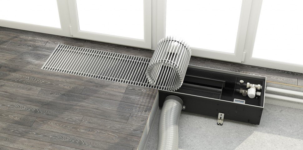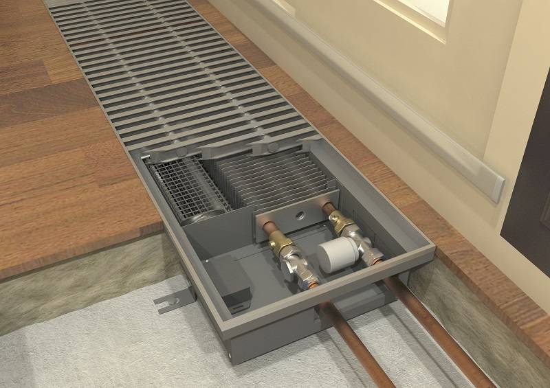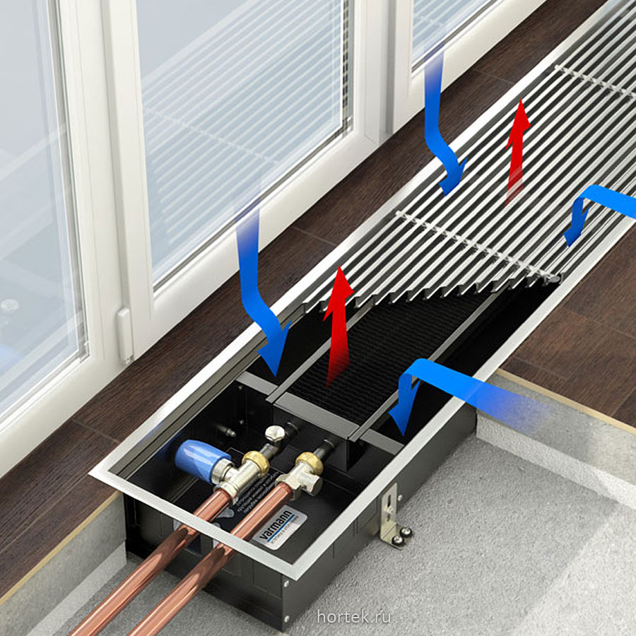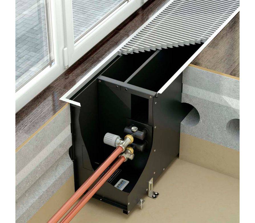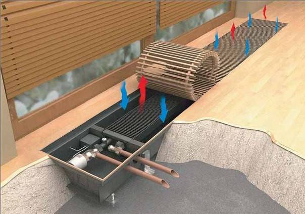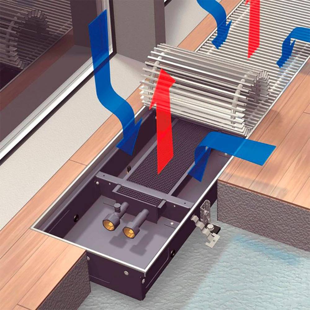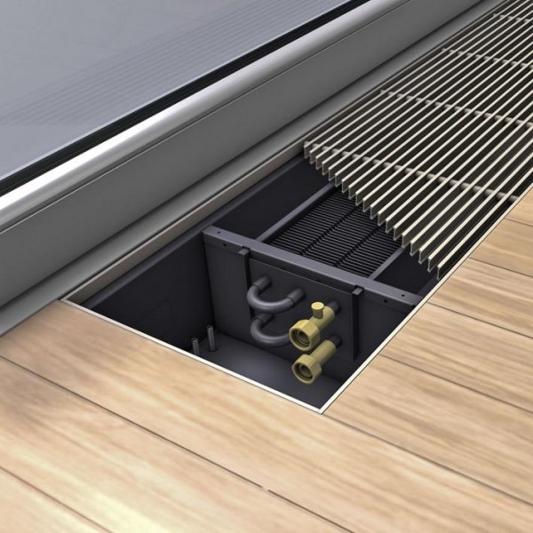 Il existe un autre type de convecteurs de chauffage, très différent de ceux évoqués ci-dessus et donc à part. Ils sont inhabituels dans leur lieu d'installation - dans une niche située sous le niveau du sol. Avec un degré de probabilité élevé, de tels appareils de chauffage peuvent être trouvés dans des locaux commerciaux ou des bureaux dotés de grandes fenêtres panoramiques, contre lesquelles des radiateurs ou des convecteurs ordinaires ne sembleront pas tout à fait appropriés.