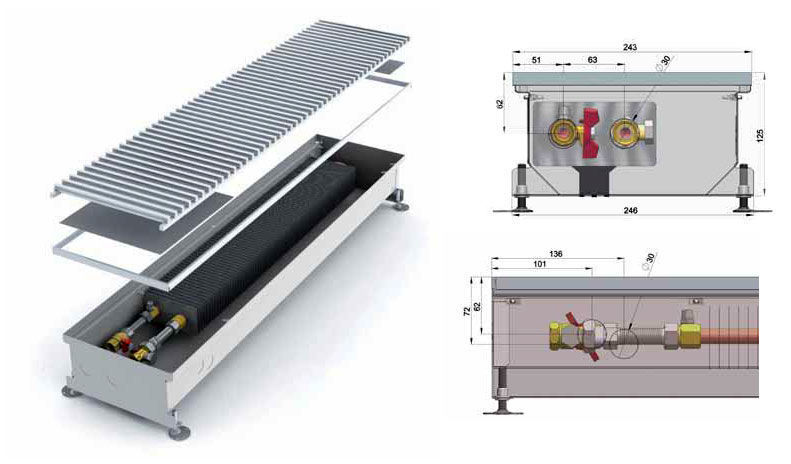 La hauteur du corps des convecteurs encastrés dans le sol peut varier de 50 à 130 mm, et la longueur peut atteindre 3 m de sol à travers lequel l'air chauffé monte.