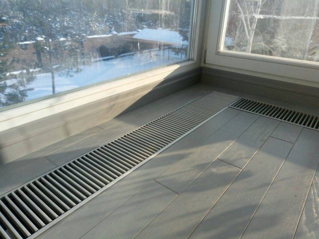 Cela résout le problème de la zone froide. Et le problème de la conception est également supprimé (beaucoup de gens pensent que c'est l'essentiel), - au lieu de tuyaux et de radiateurs, une élégante bande étroite de grille apparaît sur les murs du sol sous l'ouverture de la fenêtre.