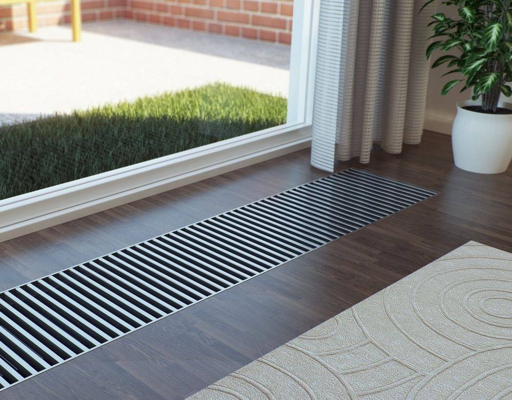 Dans le cas de grandes portes-fenêtres, les convecteurs au sol sont une option indispensable pour les équipements de chauffage. D'une part, et nous l'avons déjà mentionné, ils, étant situés sous le niveau du sol, n'interfèrent pas avec l'examen. En revanche, ce sont ces convecteurs qui chauffent le plus efficacement une pièce avec des baies vitrées.L'air froid de la fenêtre entre dans le convecteur par la grille et de là, il sort de la même manière déjà chaud.
