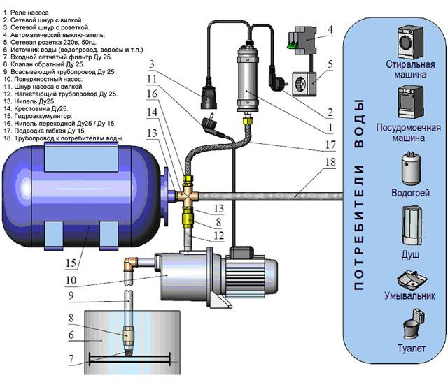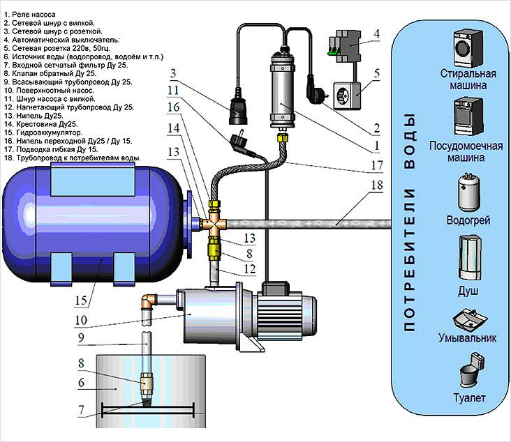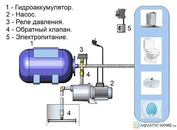 La différence concerne l'utilisation de dispositifs supplémentaires, tels qu'un accumulateur hydraulique, un pressostat, etc. Il est extrêmement dangereux d'installer un équipement de pompage sans moyens de contrôle et de réglage - principalement pour l'équipement lui-même.