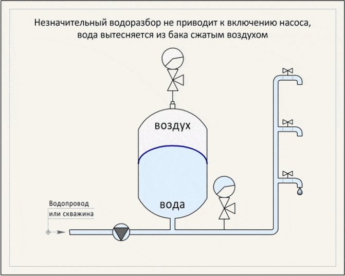 - Lorsque de l'eau est consommée (ouverture d'un robinet, utilisation d'une douche ou d'un équipement consommateur d'eau), la pression ou le niveau dans le système diminue, ce qui contribue à l'alimentation en fluide de la chambre d'accumulation/réservoir de stockage. Ainsi, le débit d'eau de l'accumulateur est effectué jusqu'à ce qu'une valeur critique de pression / niveau soit atteinte. Après cela, la pompe est remise en marche et le cycle se répète.