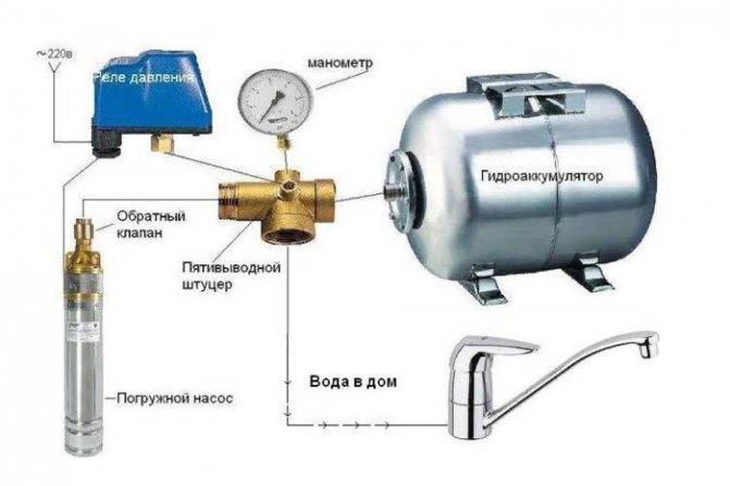 La photo montre un schéma d'un dispositif d'alimentation en eau basé sur une station de pompage avec un accumulateur hydraulique