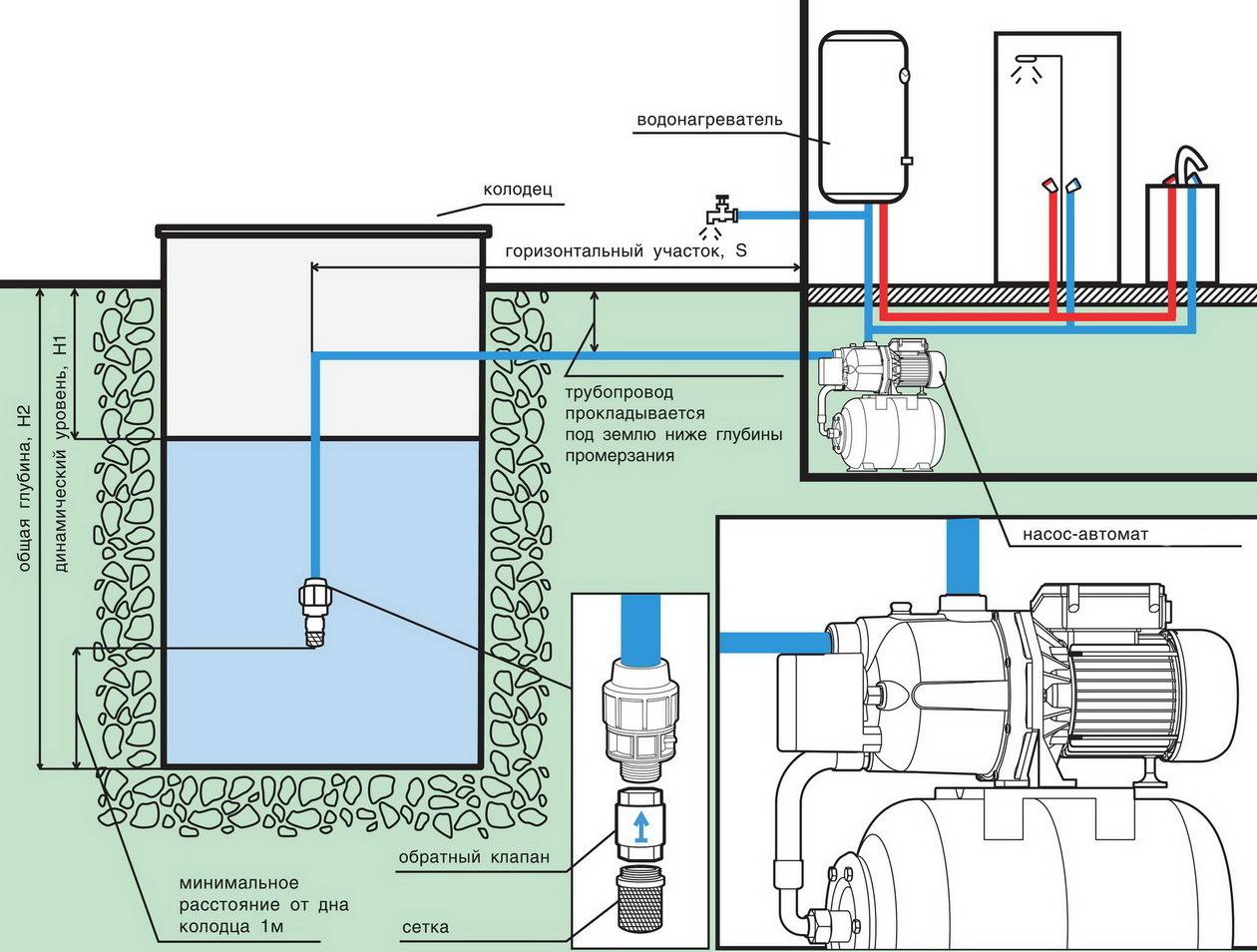 - Une prise d'eau située dans un puits ou un puits est équipée d'un maillage filtrant qui empêche les particules d'impuretés relativement grosses de pénétrer dans le système. Un clapet anti-retour est également situé ici pour empêcher l'écoulement inverse de l'eau lorsque la pression chute ou que la pompe cesse de fonctionner.
