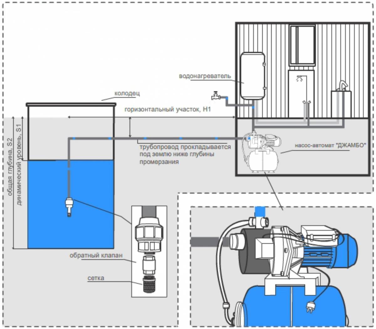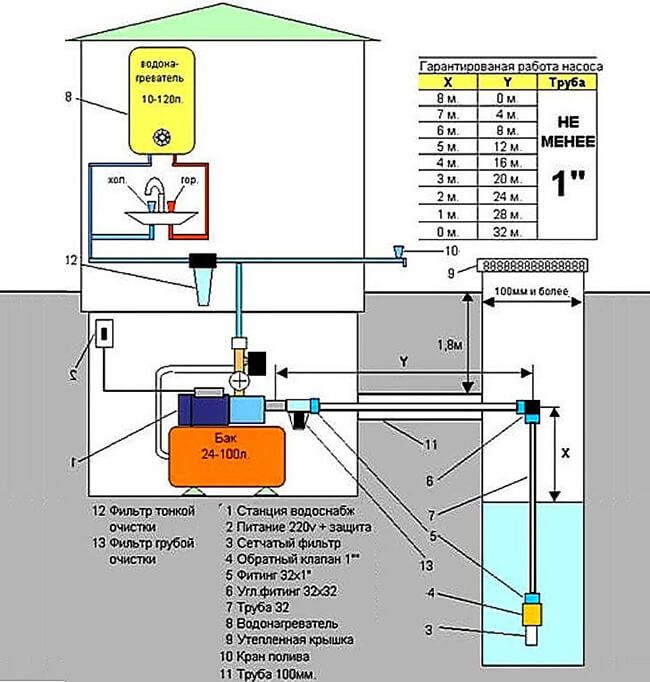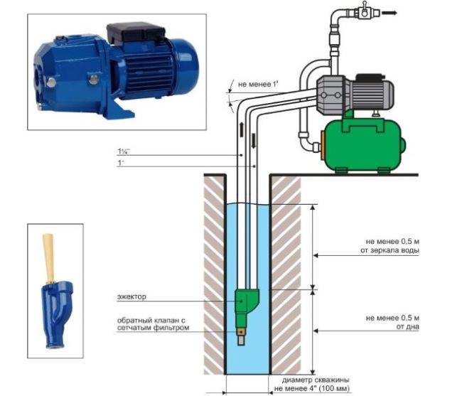 Si le calcul hydraulique de la station de pompage montre une certaine marge d'opportunité, il est préférable de l'installer dans une pièce chauffée et pratique pour l'entretien. Dans le cas de l'utilisation de puits profonds, vous devrez utiliser une pompe submersible ou prendre un modèle de surface avec un éjecteur externe, équipant un caisson directement au-dessus de la prise d'eau.