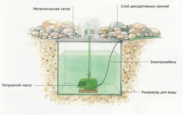 pompe à eau à partir de 1100 W de puissance; tuyau en cuivre d'une section de 15 mm pour amener l'eau de la pompe au sommet de la fontaine; mm; un tuyau en plastique ou en métal pour le câblage d'un câble électrique; un raccord pour le raccordement un tuyau en cuivre et une pompe ; un régulateur d'alimentation en eau de type flotteur ; un treillis métallique pour protéger le réservoir des débris ; du gravier de drainage ; un tuyau en polystyrène pour la sortie du cordon de la pompe ; des barres pour fixer le treillis ; des pierres pour le partie décorative supérieure de la fontaine (peut être remplacée par des pots en argile, des bols en béton, etc.); un robinet avec un adaptateur et un filtre.