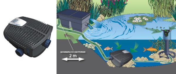 Des pompes submersibles sont utilisées dans de tels réservoirs. Ils sont placés sur le fond, installés dans un panier avec des pierres ou simplement en écrasant le corps avec plusieurs rochers. Il prend l'eau du réservoir et l'alimente dans un tuyau fixé au tuyau de sortie. Ce tuyau et jeter à l'endroit où l'eau coulera.