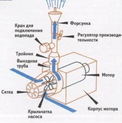 Une pompe de fontaine typique se compose d'un corps en forme d'escargot. Il abrite le moteur et les pales, semblables aux pales du ventilateur. Deux canalisations sont reliées au corps - l'eau est acheminée par l'une et l'eau est fournie par l'autre.