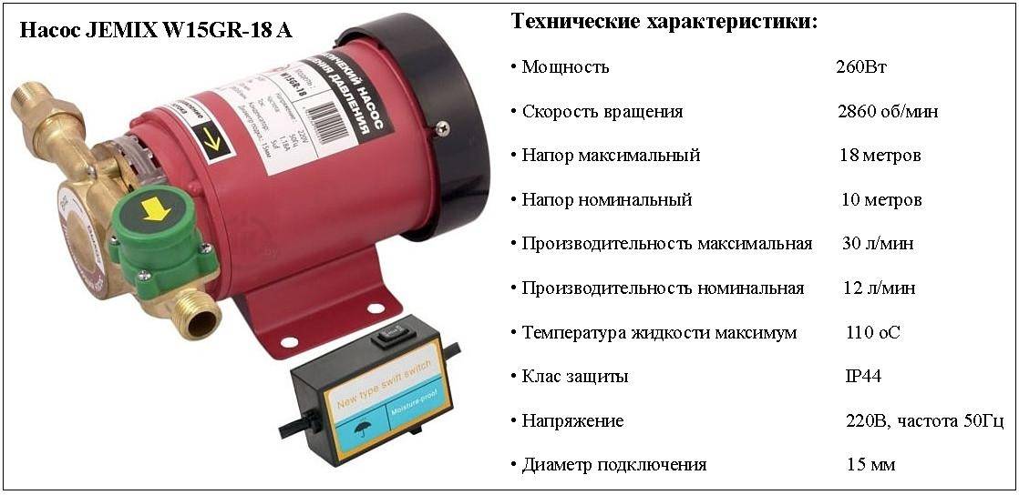 La pompe à eau rotative à sec Jemix W15GR-15 A pour une maison privée avec un corps en fonte a un démarrage automatique pratique, qui s'allume lorsque le débit d'eau est de 0,09 à 0,12 m3 par heure. En même temps, il y a une protection contre le fonctionnement à sec et une pression est créée jusqu'à 15 mètres de haut. La courte durée de vie (au moins trois ans avec une réparation sous garantie dans les douze mois calendaires), indiquée dans la spécification de l'appareil, peut en fait être augmentée s'il n'est pas utilisé à des températures extrêmement élevées (le liquide maximum pompé à travers cette pompe peut avoir une température de 110 C).