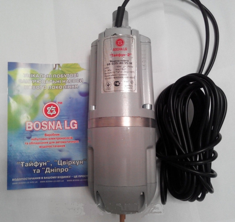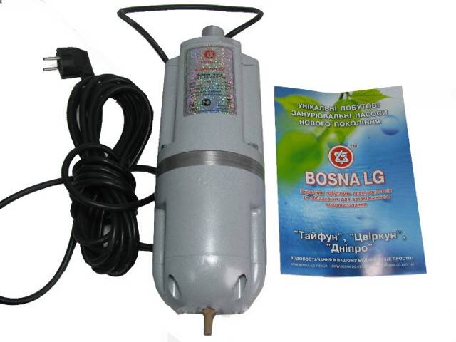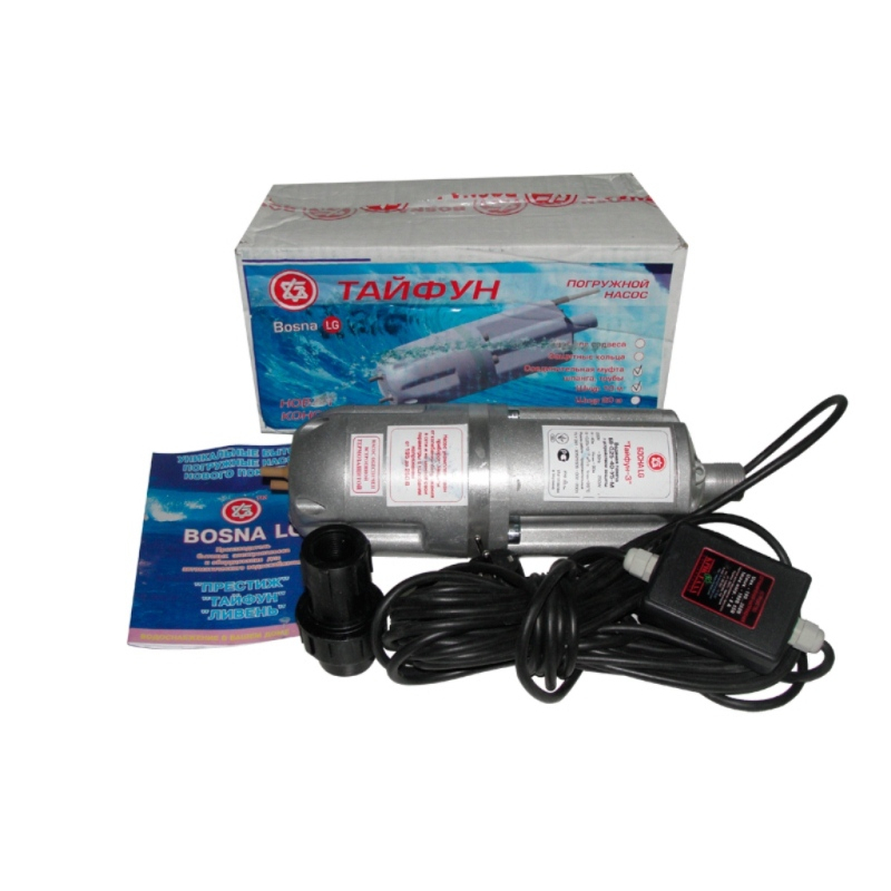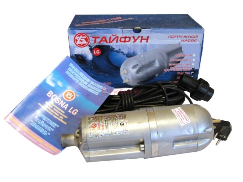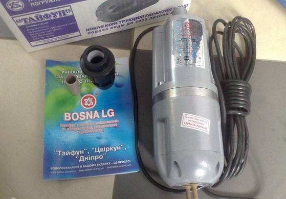 Bosna LG (Ukraine) produit trois marques de pompes électriques submersibles pour l'eau froide pure "Typhoon" dans un boîtier en fonte. Toutes les pompes à eau de cette série sont conçues pour travail à partir du réseau électrique avec une tension de 220 V. La prise d'eau est plus faible, ce qui oblige à suspendre ces pompes à une certaine distance du fond.