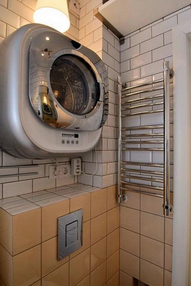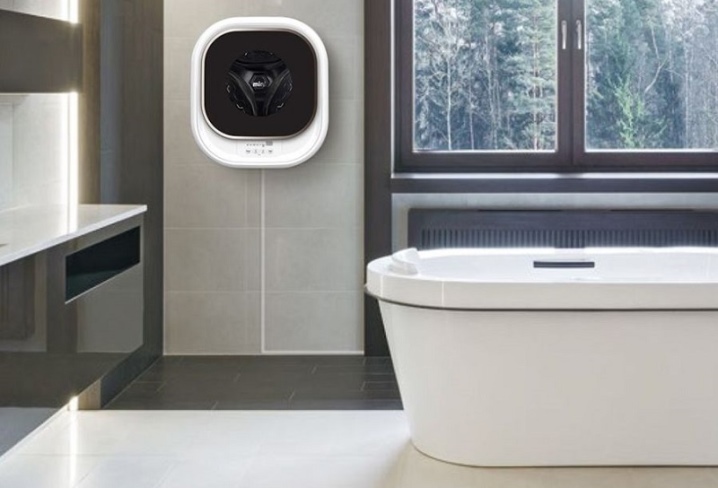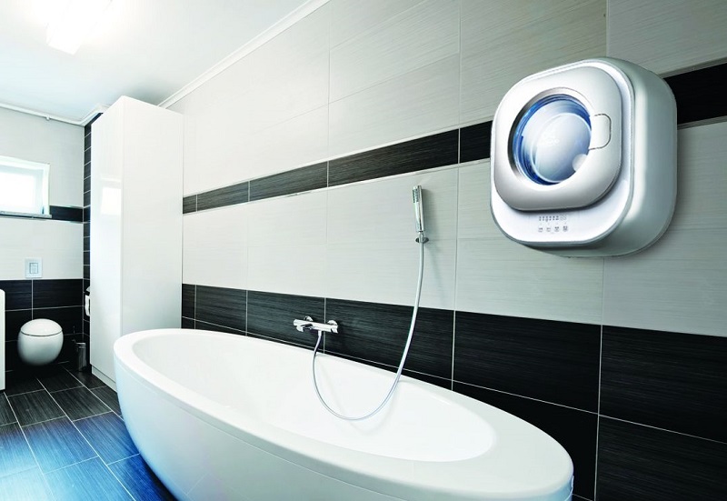 Dans tous les sens, une telle machine peut être accrochée au mur de la salle de bain. Son apparence ne se détériorera pas un peu, car il a un design ultra-moderne spécial pour les modèles d'appareils électroménagers - style high-tech.