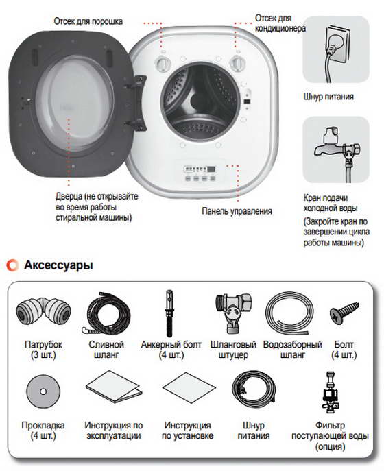 Après avoir acheté une machine à laver suspendue de fabrication coréenne, il est important d'étudier le manuel d'instructions. Il est généralement livré avec l'appareil lui-même.