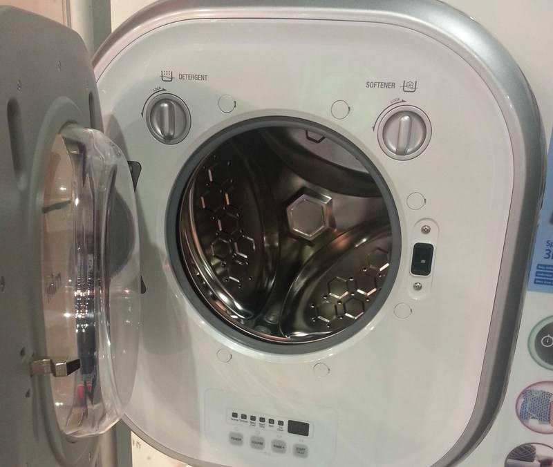 La première machine à laver est réalisée sous la forme d'un parallélépipède brillant aux angles arrondis - dans les meilleures traditions futuristes. Le tambour est chargé par l'avant et la porte est en plastique transparent, à travers lequel des détails argentés sont visibles. Il ressemble à un hublot.
