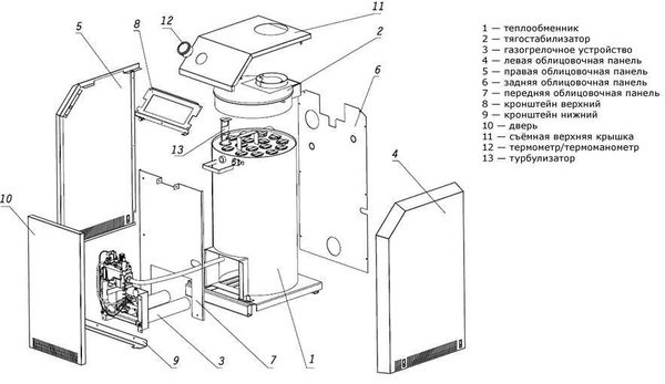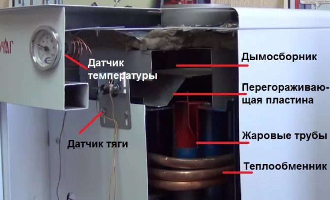 Les gaz chauffés sont transportés à travers des canaux qui, dans le complexe, sont appelés échangeur de chaleur. Les caractéristiques de conception sont que les parois de l'artère remplissent simultanément la fonction de cloisons du circuit d'eau, le long desquelles le liquide de refroidissement se déplace constamment, chauffant la surface métallique. Le processus de combustion est associé à une émission intensive de gaz de combustion, constitués en partie de suie, de goudron, qui créent des dépôts à l'intérieur de la chaudière, sur la cheminée. Par conséquent, le fabricant recommande un nettoyage régulier de l'équipement au moins une fois tous les 30 jours et lors de la préparation de l'appareil pour la saison de chauffage.
