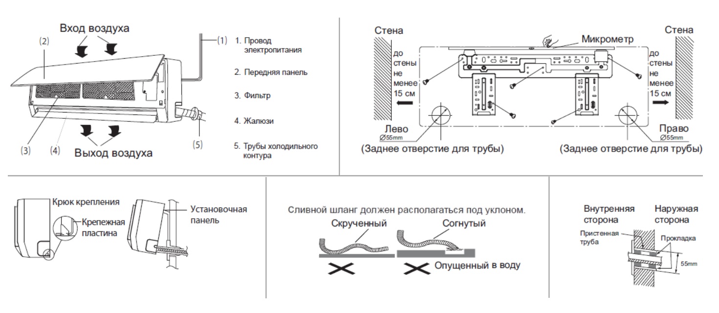 En fait, les principales différences entre les différents systèmes split sont observées lors de l'installation de l'unité intérieure, les modules externes sont montés et connectés à la pièce partout selon le même schéma, comme décrit dans le plan d'installation du climatiseur mural LG.