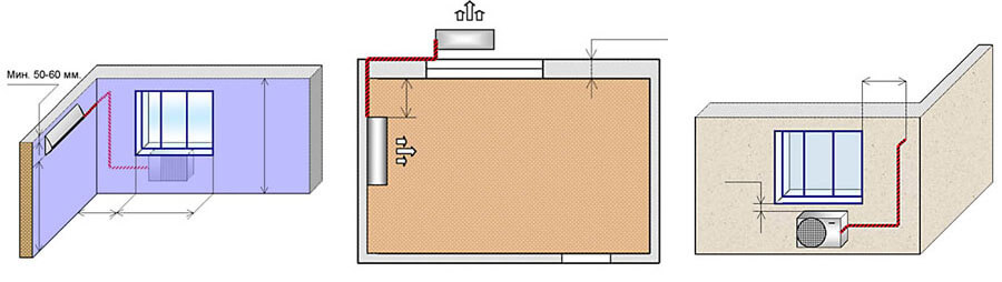 • Il est préférable de percer un passage dans le mur pour le circuit de refroidissement. Les communications seront cachées, ce qui préservera l'esthétique de la pièce. Si la réparation a déjà été effectuée, les tuyaux sont fermés avec une boîte en plastique. Dans le même temps, il est nécessaire de fournir un accès aux connexions pour la maintenance du service.