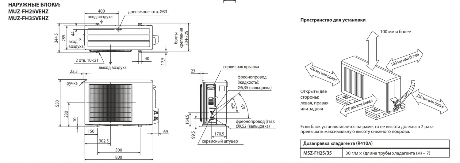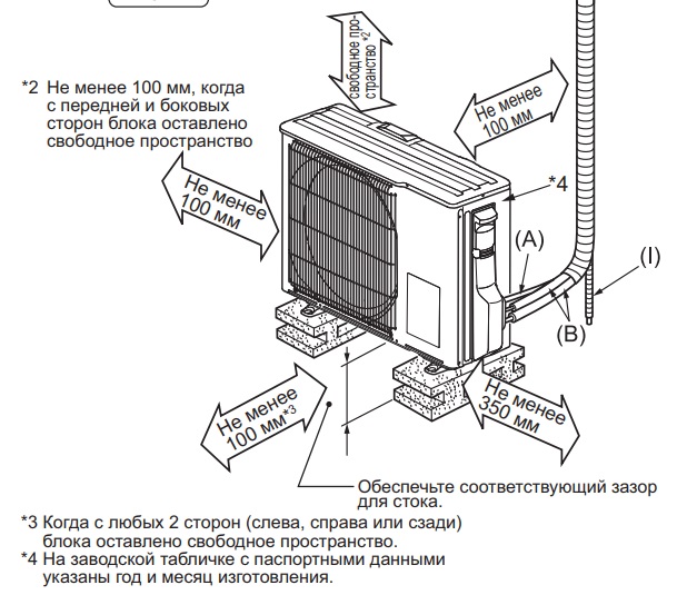 Il est nécessaire d'isoler les raccords de tuyauterie sur l'unité intérieure pour éviter la condensation d'humidité sur la surface extérieure des tuyaux et des traînées sur le mur sous l'unité intérieure. L'unité extérieure est installée sur une structure de support de type L. L'appareil doit être installé à une distance de sécurité du mur pour permettre la libre circulation de l'air à travers le condenseur, son entretien et son nettoyage ultérieurs.