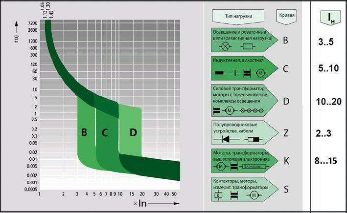 Une forte décomposition du graphique lorsque la valeur du coefficient de plage est de 5 à 10 unités est due au fonctionnement du déclencheur électromagnétique. Pour les commutateurs de type "B", cela se produit à une valeur de 3 à 5 unités, et pour le type "D" - de 10 à 20.