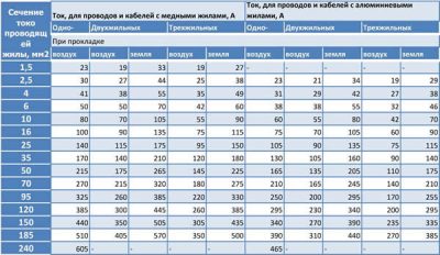 Dans le tableau, nous trouvons la section de fil sélectionnée pour cette ligne. Supposons que nous ayons besoin de poser un câble d'une section de 2,5 mm2 (le plus courant lors de la pose d'appareils de moyenne puissance). Un conducteur avec une telle section peut supporter un courant de 27 A, et la puissance recommandée de la machine est de 16 A.