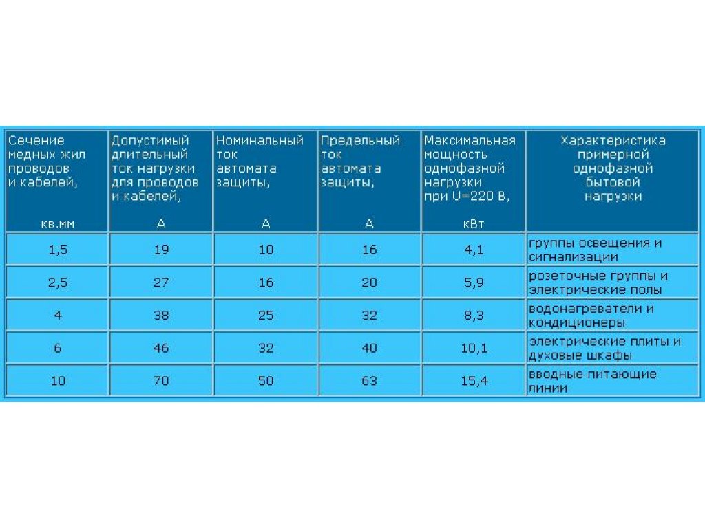 | la Coupe transversale conducteurs, mm² | Permis courant, un | Max. Puissance charge, kW | Courant automatique, un | Possible consommateurs |