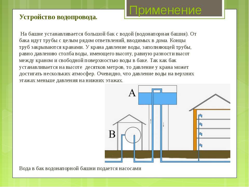 Comme elle est facile à calculer, la pression d'eau d'une alimentation en eau municipale ne peut généralement différer de sa valeur au dernier étage que de 0,25 MPa, ce qui correspond à une pression de 25 mètres. Avec une hauteur du bâtiment plus élevée aux étages intermédiaires, un pompage intermédiaire doit être installé.