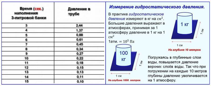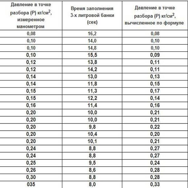 Il est également possible de calculer la pression estimée en effectuant une série de calculs mathématiques. Vous devrez vous armer d'un bocal de trois litres et d'un chronomètre. Nous ouvrons l'eau à pleine puissance, après quoi nous substituons un pot sous le jet et activons le compte à rebours.