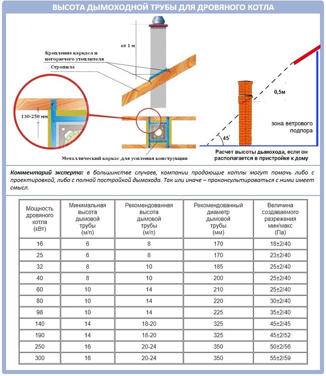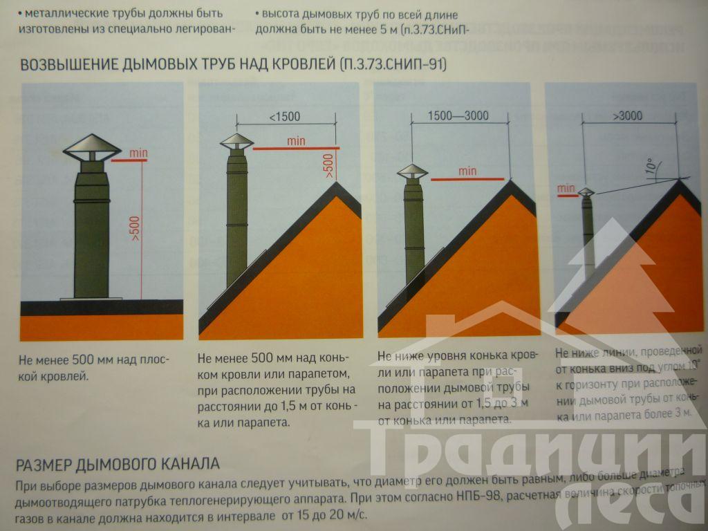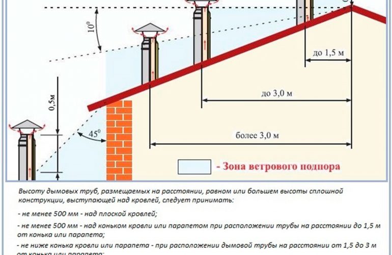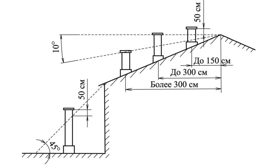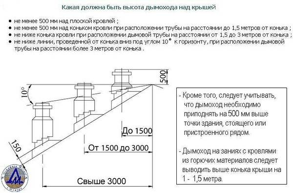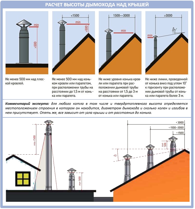 La hauteur de l'embouchure au-dessus du toit pour une conception standard est généralement choisie à 1 m, dans le cas d'un évasement, à au moins 2 m au-dessus du point le plus haut du toit. En cas d'urgence - la mine est élevée à une hauteur d'au moins 3 m du sol.