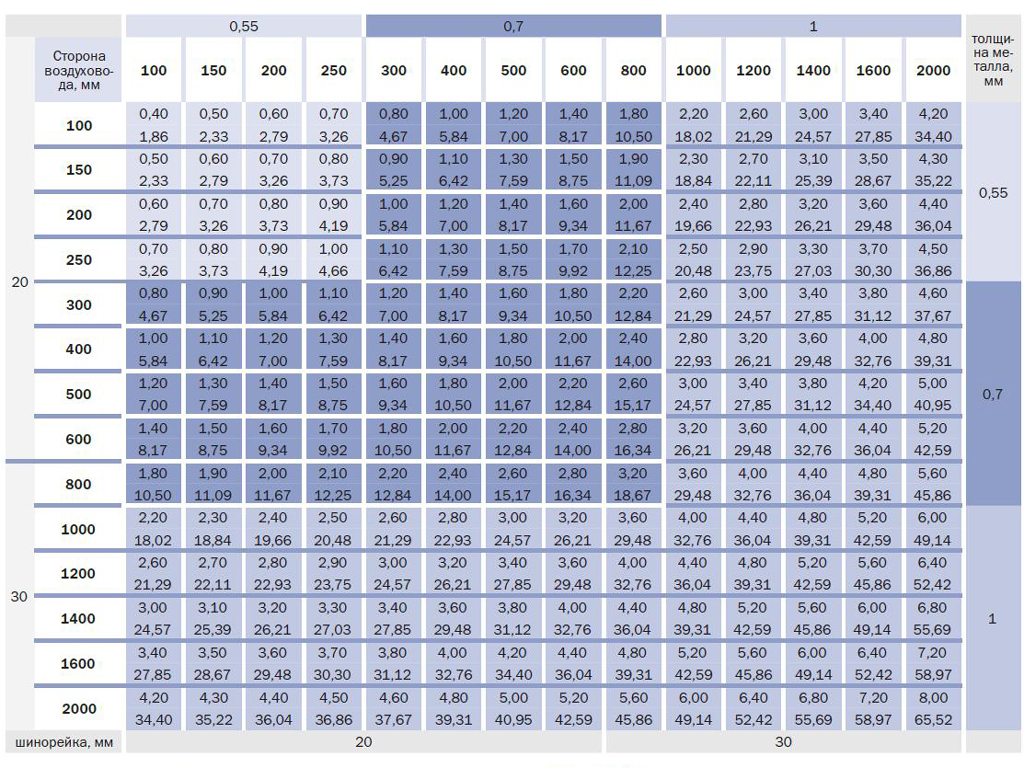 La consommation de fixations dans le répertoire est indiquée en kg par 100 m². M. surface. Par exemple, pour les conduits d'aération ronds de feuillure de classe H, en tôle d'acier de 0,5 mm d'épaisseur et d'un diamètre allant jusqu'à 20 cm, 60,6 kg de fixations par 100 mètres carrés seront nécessaires. M.