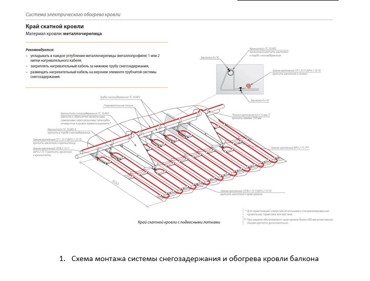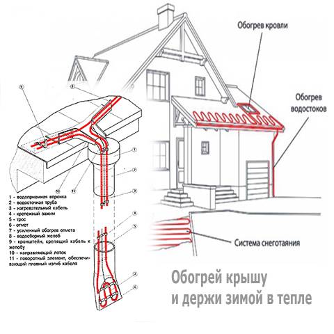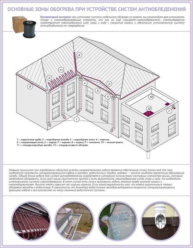 Vous devez d'abord déterminer quelle zone du toit nécessite un chauffage. Comme déjà mentionné, ce sont des vallées, des surplombs et des lieux d'accumulation d'une grande quantité de neige et de glace, ainsi que des drains