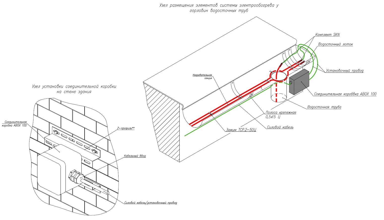 Câble chauffant à l'intérieur des entonnoirs fixé avec du ruban adhésif et des rivets. Sur le toit - sur un ruban de montage collé sur un mastic ou sur une mousse de montage.