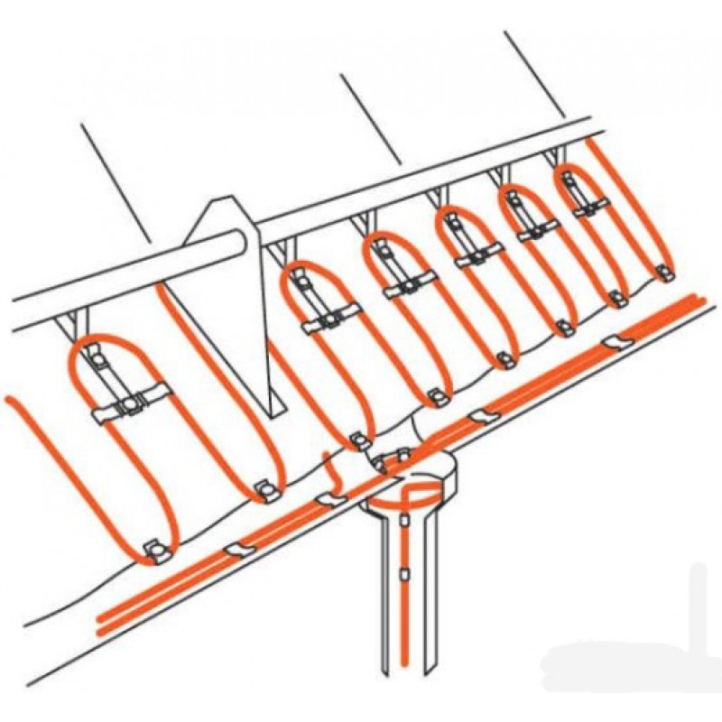 1. Sur les surplombs du toit, un câble résistif est placé dans un fil. Cela se fait en zigzags afin que le fil ne se casse pas lorsque le capuchon de neige se détache.Le fil est fixé à la base avec du ruban adhésif double face ou du mastic.