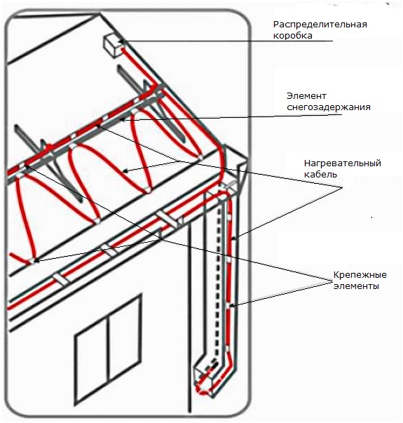 Conclusion la troisième. Les câbles chauffants doivent être installés tout au long du parcours où passe l'eau de fonte. L'installation commence par des gouttières horizontales (plateaux) et se termine aux endroits où l'eau sort des gouttières. Si la conception prévoit des entrées dans le collecteur d'eaux pluviales, il est également installé sous la profondeur de congélation en direction des collecteurs.