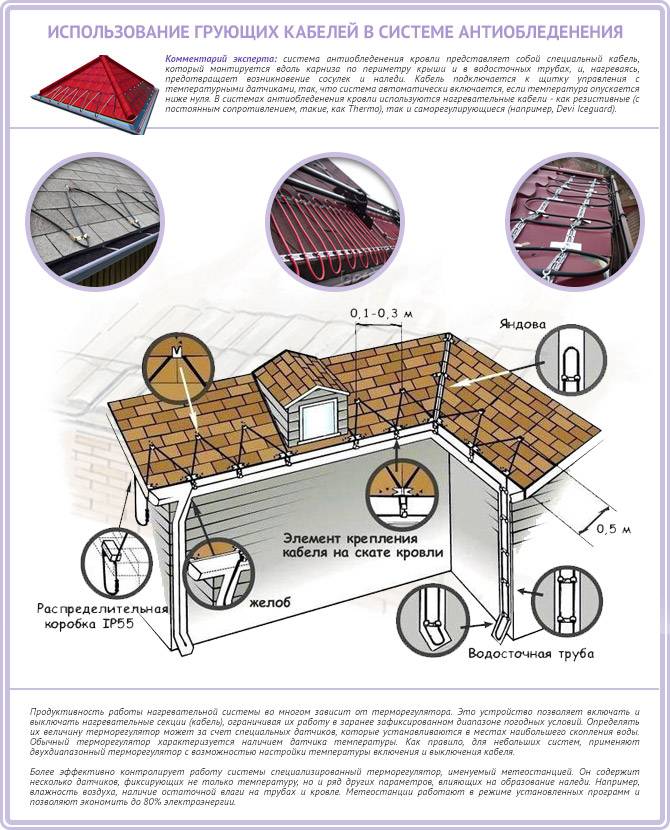 Les systèmes d'antigivrage à base de câbles chauffants sont mis en place en tenant compte des caractéristiques de conception de la toiture. S'ils sont conçus correctement, la formation de givre est complètement exclue. De telles structures présentent des avantages indéniables.