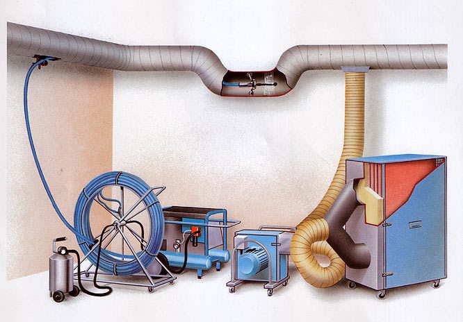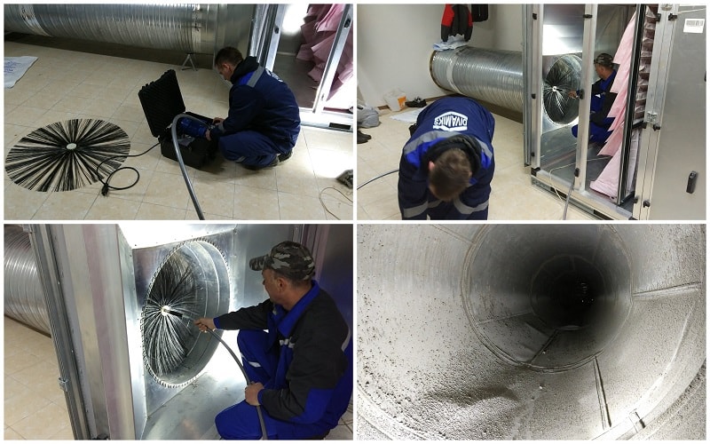 En effet, le nettoyage des conduits de ventilation et des conduits d'air se déroule en deux temps. Lors de la première étape, une inspection des surfaces internes est effectuée pour évaluer le degré de contamination de la mine. Pour cela, un équipement spécial est utilisé, équipé de caméras et de petits projecteurs.