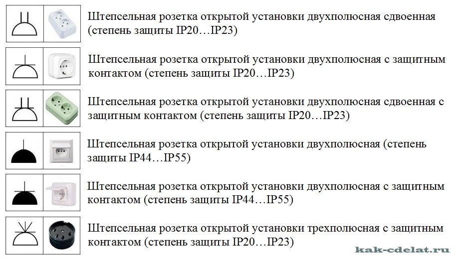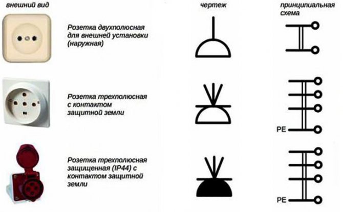 Lors de la conception et de la construction d'installations électriques, il est très important d'établir correctement les schémas techniques. Graphiquement, les prises sont indiquées très facilement - sous la forme d'un demi-cercle avec un ensemble de tirets, ce qui facilite l'application d'une image aux dessins, schémas ou croquis
