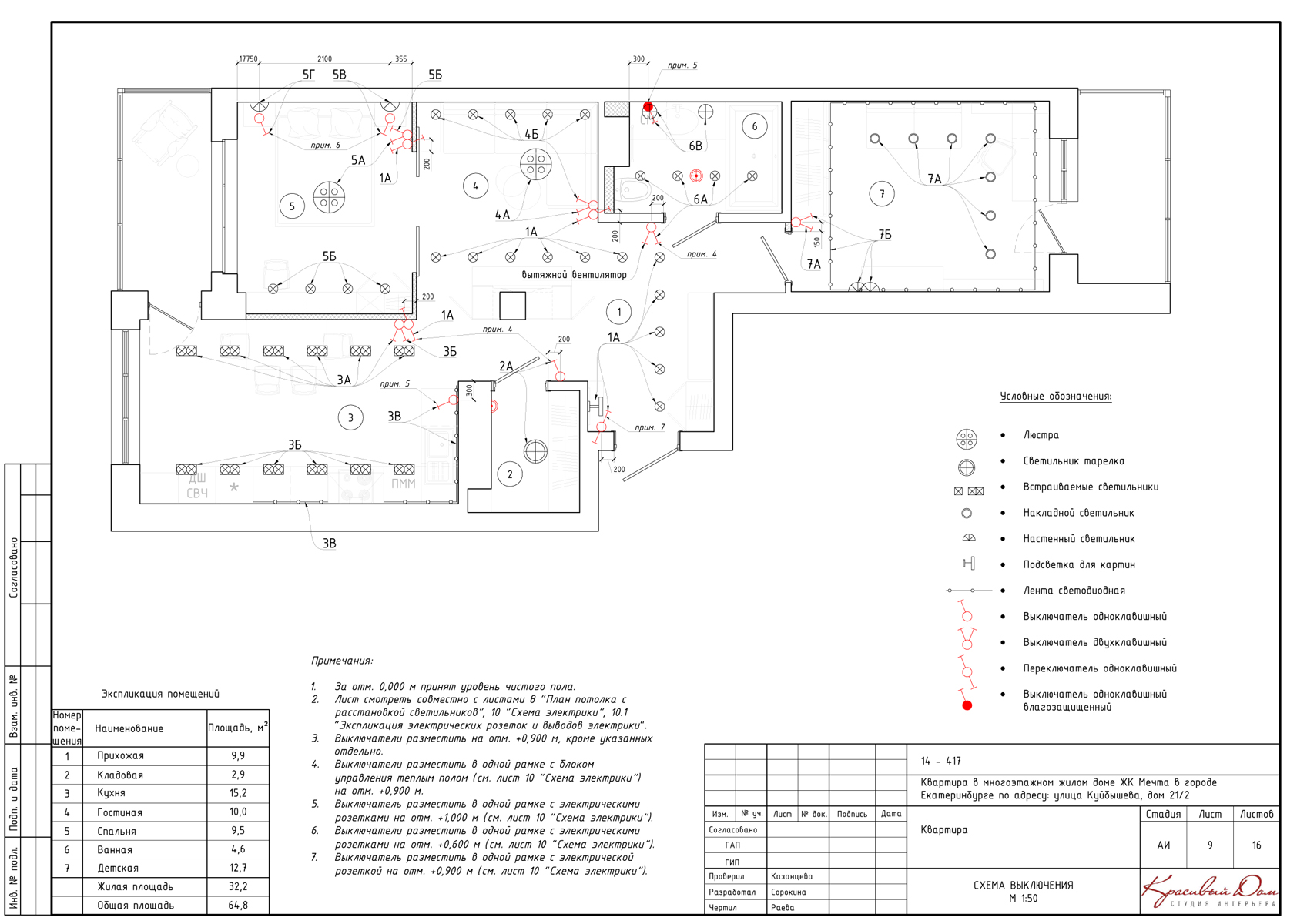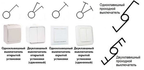 Comme les prises, les interrupteurs d'éclairage sont inclus dans la documentation du projet. Une caractéristique est une prise à deux pôles, deux sont une double prise à deux pôles, trois, ayant la forme d'un ventilateur, sont une prise à trois pôles.Ils sont indiqués par un demi-cercle vide qui n'a pas de lignes supplémentaires à l'intérieur.