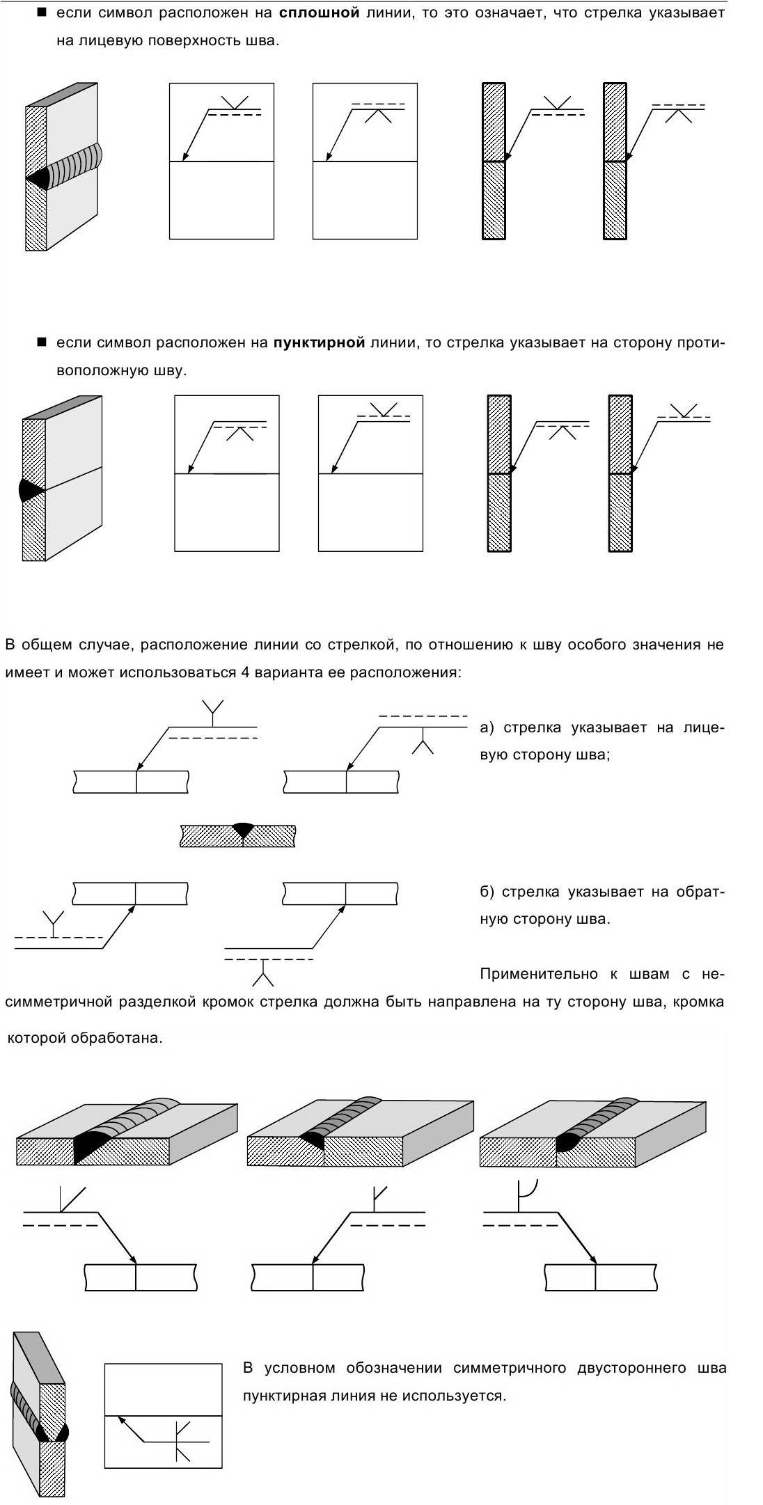 La flèche peut être réalisée avec une étagère pour accueillir le symbole de couture et, si nécessaire, des signes auxiliaires. Le symbole est placé au-dessus de l'étagère si la flèche pointe vers la face avant de la soudure (c'est-à-dire si elle est visible), ou en dessous de l'étagère lorsque le joint est situé sur l'envers (c'est-à-dire si le joint est invisible). Dans le même temps, le côté à partir duquel le soudage est effectué est considéré comme le côté avant du joint unilatéral du joint soudé. Pour la face avant du joint double face du joint soudé avec des bords préparés de manière asymétrique, le côté à partir duquel le joint principal est soudé est pris. N'importe quel côté peut être considéré comme le côté avant d'un joint soudé à double face avec des bords préparés symétriquement.