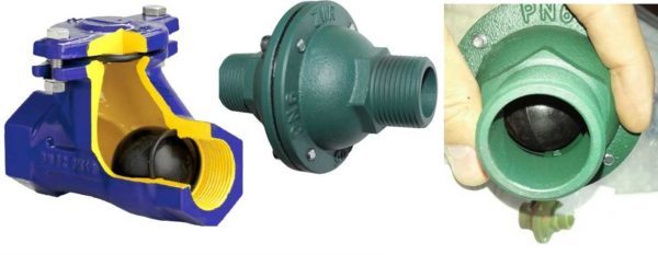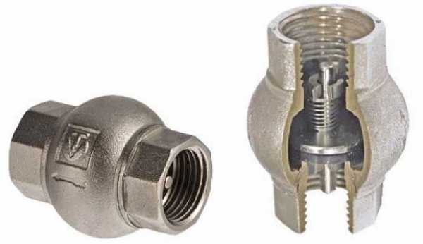 Clapet anti-retour pour chauffage: action, types, avantages et inconvénients + schéma d'installationLe type de clapet anti-retour le plus courant est le clapet à bille. Il empêche l'écoulement des eaux usées dans la direction opposée.Le dispositif d'une telle vanne est simple, il ressemble à ceci: le dispositif d'obturation est ici une bille métallique, qui est pressée par un ressort lorsqu'une contre-pression apparaît.