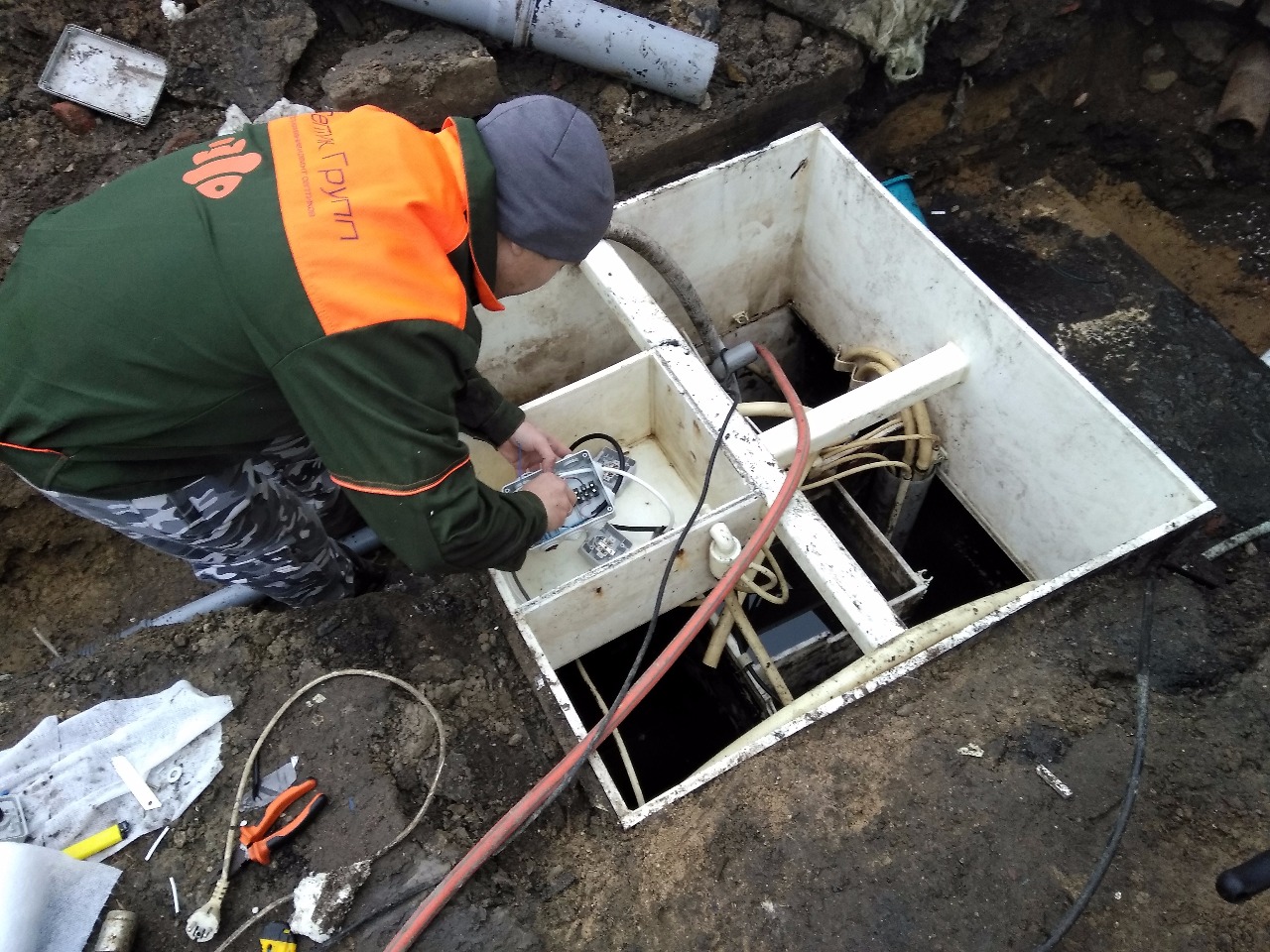 Avec l'unité éteinte, retirez le tuyau de la pompe mamut du clip de fixation et faites-le sortir de la station, retirez le bouchon en desserrant le collier métallique à l'extrémité du tuyau. Nous allumons l'installation en phase directe (l'interrupteur à flotteur dans la chambre de réception est relevé de force). Après avoir pompé environ 50% du volume (environ 1 mètre de colonne de liquide) de la chambre dans un récipient préalablement préparé, nous éteignons l'installation. nous fixons le bouchon et fixons le tuyau dans sa position d'origine.