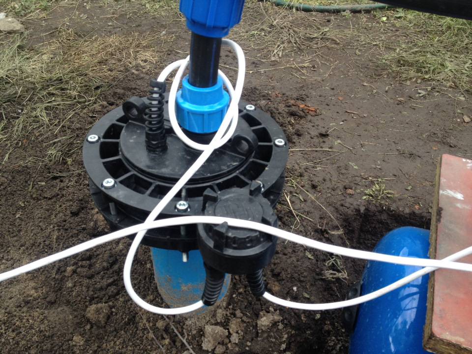 La tête est choisie en fonction du diamètre du tube de tubage et, après avoir été posée dessus, est fixée avec une bride. Le couvercle d'entrée a des ouvertures pour l'entrée du câble d'alimentation et du tuyau d'eau. Tous les joints avec des tuyaux et des câbles sont solidement scellés avec des joints en caoutchouc. Un joint est installé sous le couvercle avant la fixation avec des boulons.