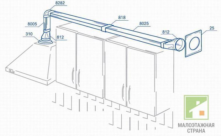 Si vous faites attention au catalogue des éléments façonnés pour les conduits d'air en plastique, vous pouvez y trouver tous les composants nécessaires de l'itinéraire. Par exemple, considérons la situation où hotte de cuisine encastrable il est nécessaire de conduire une ligne rigide jusqu'au puits de ventilation.Dans le même temps, il est prévu d'installer un conduit plat