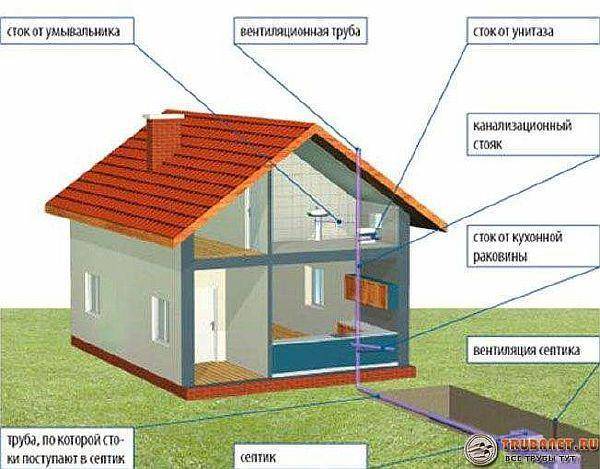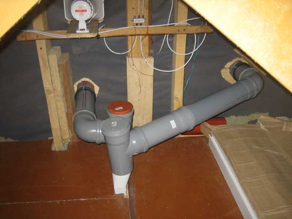- Les tuyaux sont introduits dans les trous. Vous pouvez amener chaque tuyau verticalement sur le toit (c'est mieux, mais il y a beaucoup de travail pour faire des trous dans le toit, un grand nombre d'entre eux n'ajouteront pas de beauté à la structure). Dans le grenier, un tuyau de la salle de bain est conduit par une branche à la structure verticale des toilettes. À l'aide d'un té, les lignes sont connectées. De la cuisine, le tuyau va séparément (strictement verticalement) au toit.