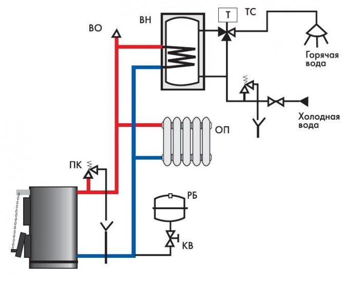 Le schéma de connexion d'un générateur de chaleur à bois est conçu pour résoudre 3 tâches (en plus d'alimenter les batteries en liquide de refroidissement):