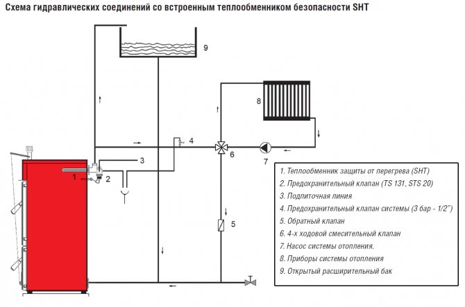 Pour charger la chaudière à l'aide d'un générateur de chaleur au bois - «indirect», vous devez intégrer ce dernier dans le circuit de la chaudière, comme indiqué sur l'image. Expliquons les fonctions éléments de circuit individuels:
