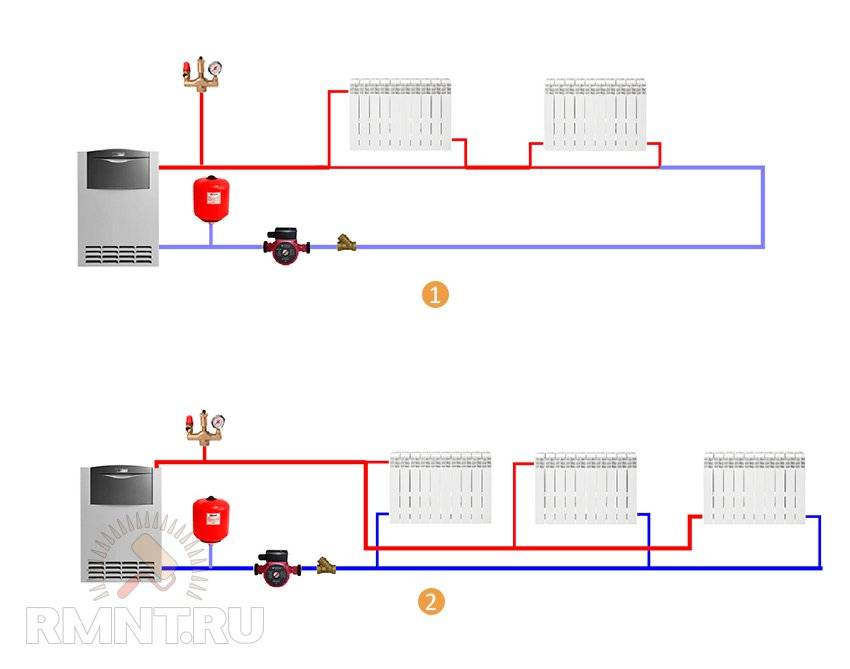 Un schéma plus complexe est celui à deux tuyaux, lorsque la chaudière chauffe soit le liquide de refroidissement, soit l'eau chaude, mais en aucun cas pas en même temps.Il est utilisé pour les maisons à deux étages avec un grand nombre de pièces. De la chaudière, l'eau chauffée ou le liquide de refroidissement est envoyé à la canalisation d'alimentation, qui doit être située dans le grenier ou dans les colonnes montantes fournissant de la chaleur, et sur chaque radiateur le cavalier et la self de contrôle sont installés. Par la canalisation inférieure, qui sert à évacuer le liquide de refroidissement, il retourne à la chaudière.