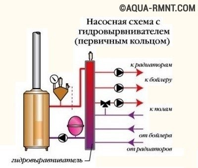 - l'accumulateur de chaleur joue le rôle d'une flèche hydraulique, plusieurs branches de chauffage peuvent être raccordées au réservoir, par exemple, radiateurs des 1er et 2ème étages, circuits de chauffage au sol ;