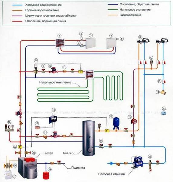 Les chiffres de 1 à 9 indiquent les vannes à boisseau sphérique installées dans les circuits d'alimentation en eau froide (1) et chaude (2), sur les conduites d'alimentation (3) et de retour (4) de chauffage, pour la vidange du liquide de refroidissement (5 et 6), sur le retour du départ de chaleur ( 8 et 9). Le reste des chiffres indique le variateur (10), le filtre magnétique (11) et le filtre à gaz (12).