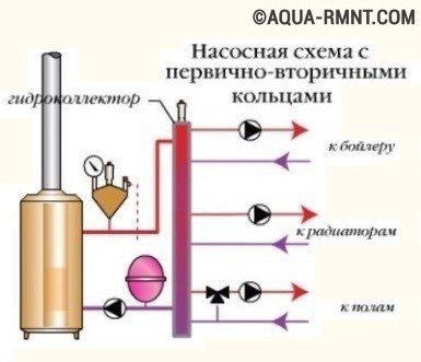 Pour les chaudières d'une capacité de 50 kW ou plus ou un groupe de chaudières conçues pour le chauffage et l'alimentation en eau chaude de grandes maisons, un schéma d'anneaux primaires-secondaires est utilisé. L'anneau primaire est constitué de chaudières - générateurs de chaleur, anneaux secondaires - consommateurs de chaleur. De plus, les consommateurs peuvent être installés sur la branche directe et être à haute température, ou à l'inverse - et être dits à basse température.