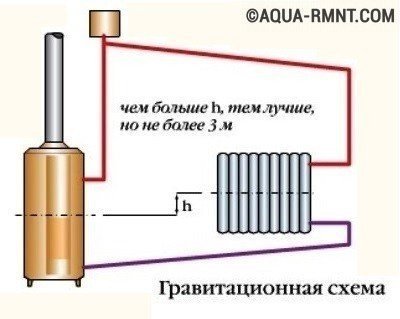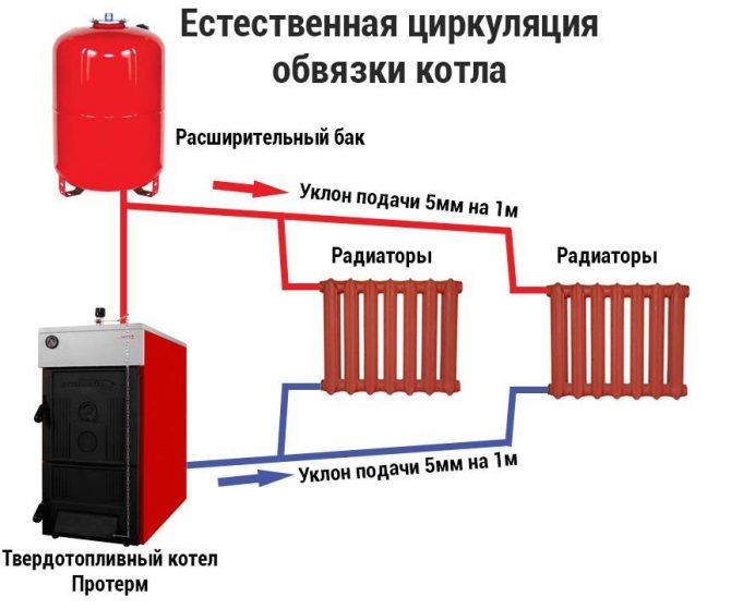 Cette tuyauterie est facile à installer et ne nécessite pas l'installation d'une pompe de circulation dans le système. Il suffit de placer la canalisation légèrement inclinée pour que le liquide de refroidissement chauffé puisse s'écouler dans les radiateurs de chauffage et que le liquide de refroidissement refroidi puisse retourner à la chaudière. Ce schéma convient aux petits bâtiments privés d'un étage.